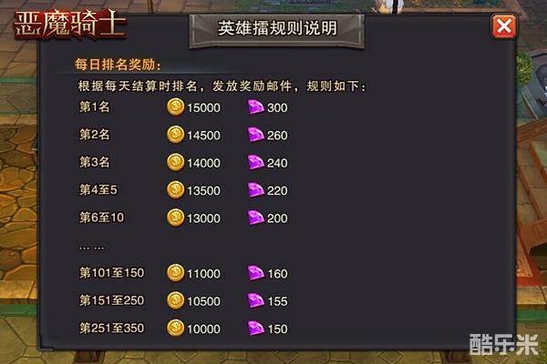 参加英雄擂的所有玩家都有每日奖励,排名前350名更有钻石大礼!下图奖励为暂定奖励,以游戏内实际情况为准。