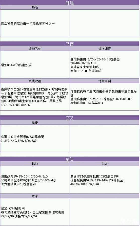钟馗改的貌似没什么卵用反正我要么不玩,要么不死马面又变成了我家甘宁,你要是3技能再加个主动的伤害技能就更棒了~夜叉怎么说呢,反正是最后学1技能,无所谓了还有乌龟我家的曹仁,可以说是增强了1技能的后期能力吧,大招确实要削一下了太无脑了。