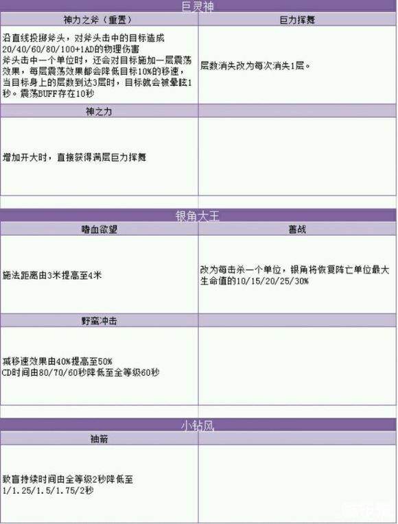巨灵神现在很像典韦啊!这个震荡效果不知道怎么算啊,是不是跟狂战士一样丢斧头,还是跟之前一样重置普攻?我也不知道是不是跟以前一样可以晕到死,反正我要让典韦跟周泰单挑~~~~银角大王现在杀人回血,尼玛完全就是疯子啊(跟我家黄盖很像),不说了我要开着疾跑追猪~~~~小钻风,削弱了前期的致盲效果,不过并不影响他抢人头的效率。