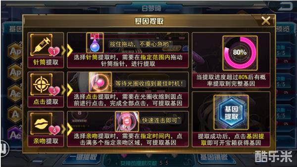 在基因提取玩法中不同好感度提取基因的方式也不同哦。每次提取基因达到相应的完成度才能正式获取完整的基因道具,否在只能获得一些基因碎片哦。