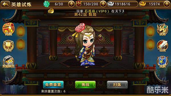 3、英雄试炼。主公可挑战试炼塔中的武将,战胜后获得银两、进阶石和黄金宝箱。挑战层数越高,奖励越多。重置后可以一键扫荡,获得奖励。每天可重置3次,随着VIP等级可提升次数,重置需要花费一定数量的元宝。
