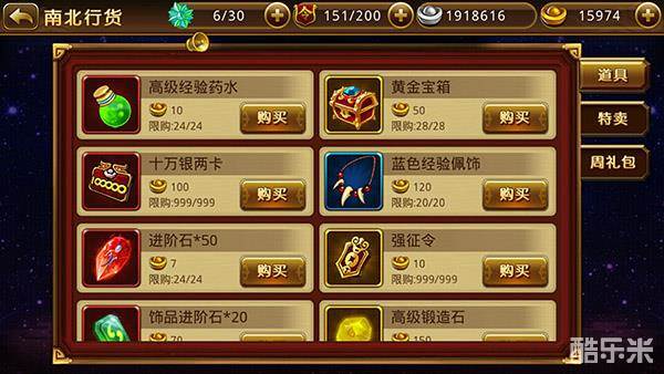 4、南北行货。南来北往的商客聚集,出售物品的地方。分为道具、特卖(每天凌晨0点刷新,每种限购1次)、周礼包(VIP等级礼包,每周可购买一次)。