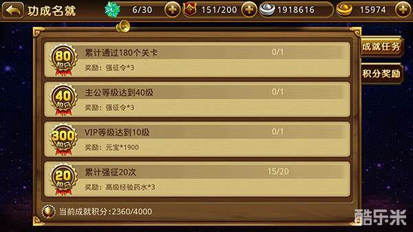 5、功成名就。记录主公所取得的成就,分为成就任务和积分奖励,奖励丰厚,但都只能领取一次,是前期重要的物资来源。