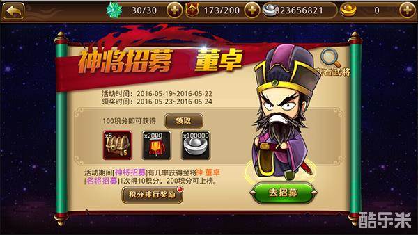 2、活动中有排行榜,名将招募一次获得10积分,积分越高则排名越靠前,且积分≥200才可上榜,根据排行榜可领取相应奖励,第一名可获得神·董卓。