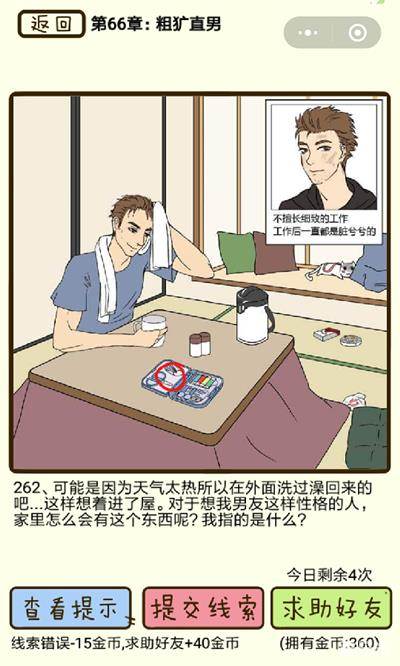 在再见吧渣男手游中粗犷直男第262关究竟该怎么过呢?在这一关中我们发现按照男友这样的性格家里应该不会有这个东西的,我们说的是什么呢?