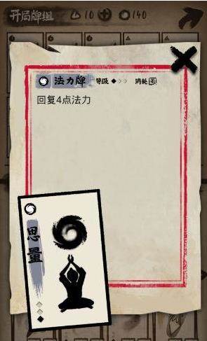 卡牌分析:思量是一张法力牌,用来回复法力的,升级后可以提升法力回复量。如果你带了这张牌,那么就必须要搭配上消耗法力的法术牌才行,武术牌可不能通过消耗法力来打出去的,这点大家要注意。这张牌建议后期与一定卡牌基础后再来使用比较好。