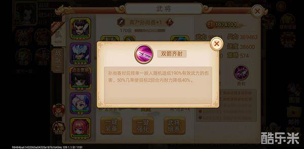 第三个是孙尚香,1星即可,50%几率减耐40%。主动技能双箭齐射如图4所示。1星孙尚香可以通过充值任意金额获取,或者1.51版本之后签到宝箱获取,是平民也可以五星的武将。