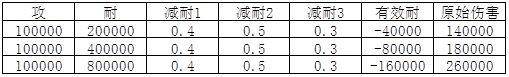 由以上实验可见,减耐确实可以减成负值,对提高伤害有帮助,具体公式如下所示伤害=(攻击力-耐力*(100%-减耐百分比之和))*(1+增伤百分比)。笔者觉得这样设定并不合理,假设某个NPC血量相同,照道理应该耐力越高越强,但是如果如上公式普遍成立,则会出现如表2所示情况,当大幅减耐至负值时,NPC的原始耐力越高,则会承受越大的伤害,同样血量情况下,死得越快。