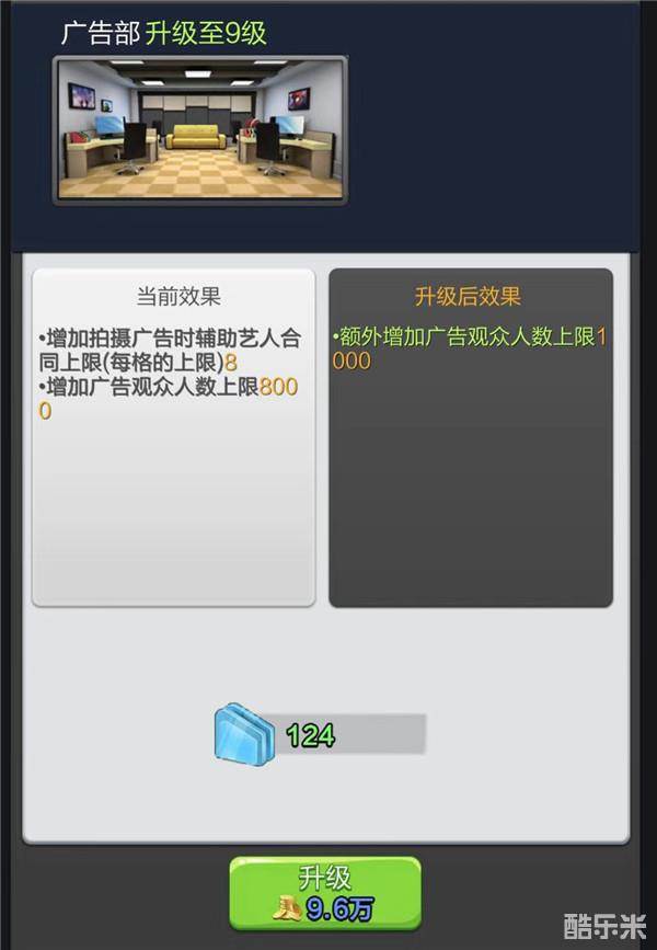 新版本中,新增商业建筑—广告部,建筑等级每提升一级,对应增加广告观众人数上限1000人并在每次拍摄广告时,可以额外增加可投入辅助艺人合同碎片数量+1,在后文,我们将通过截图看到实际的建筑升级效果。