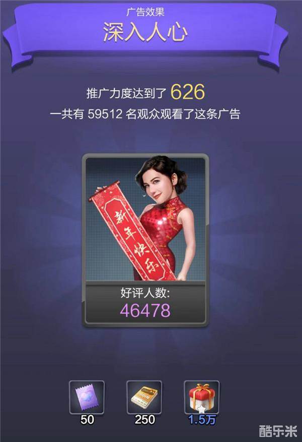 大家可以看到,当所有选项全部勾选完毕后,我们可以看到推广力度越高(白,绿,蓝,紫四个档位,具体顺序很抱歉,Chen记不太清了,但是力度条会随着加分项与辅助艺人合同数量显著提升),意味着该条广告获取的关注度和支持度已经奖励会更加的丰厚。