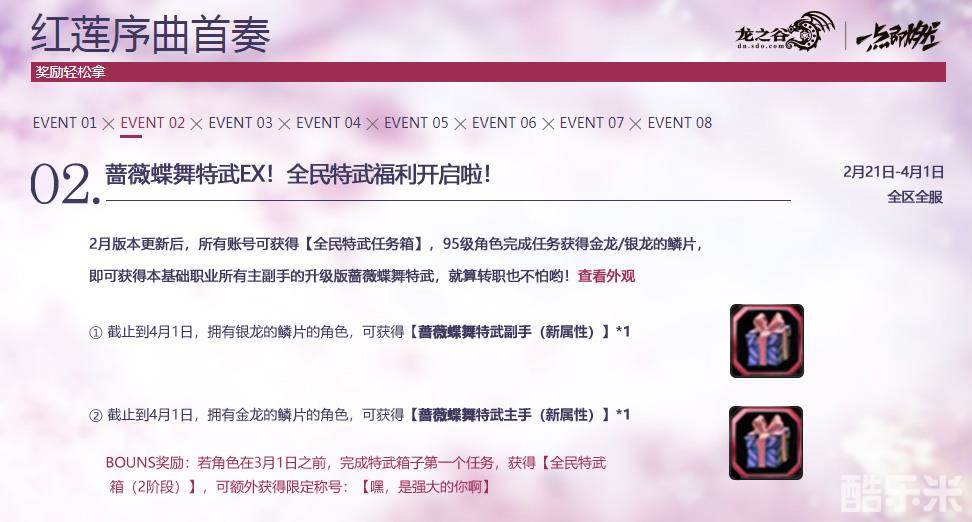 红莲宫属于巨型新主城,与之前的城镇面貌和风格截然不同。为了让谷迷们更好的在新的主城中开启全新冒险征程,《龙之谷》近期上线了做任务即免费赠送蝶舞特武活动。所有账号均可获赠【全民特武任务箱】,95级角色完成指定任务可获得金龙/银龙的鳞片,在活动结束前拥有特定鳞片的角色,即可在活动结束后免费获赠蔷薇蝶舞特武主副手各1个。而完成各类任务后(如累计在线时长/钓鱼/通关试炼巢穴等),还可获得金币、梦幻点数、保护药等进阶好礼,助力提升角色实力,为进入新主城红莲宫打下坚实基础!
