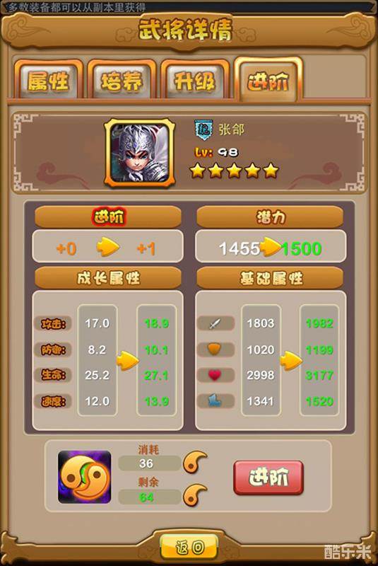 进阶:武将进阶后,将提升除兵力外的所有成长,星级越低的武将,进阶要求也越低呢。