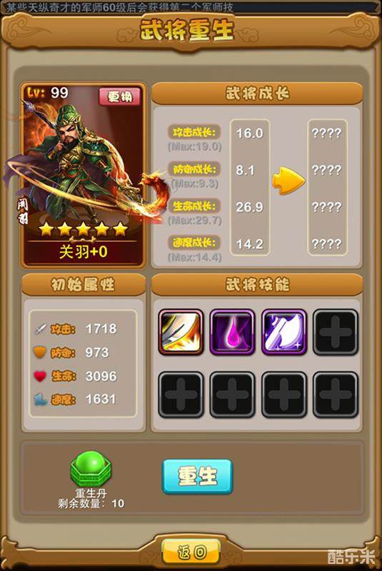 重生:每个武将的成长都是在一个区间内的,如果成长值不满意,可以使用重生丹进行重生,争取达到该武将的最大成长。重生会按武将经验返还经验丹和培养丹,不过需要注意的是,技能也会重置的!