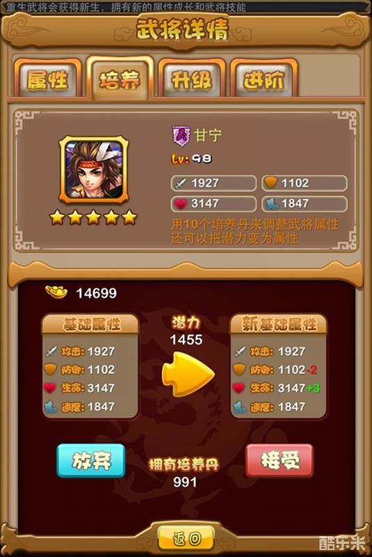 通常说来,星级高的武将当然成长高——但是!屌丝也有逆袭日,大三中有进阶、重生、培养三种途径可以提高武将的能力!
