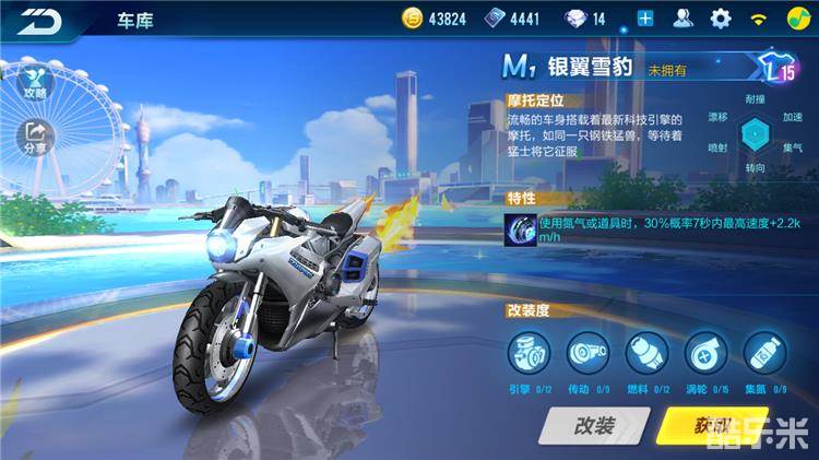 银翼雪豹各项属性均非常优秀,耐撞和转向能力尤为突出,加上出色的特性,使它在竞速和道具赛中都拥有非常完美的发挥,是一辆非常值得入手的M1摩托。