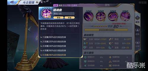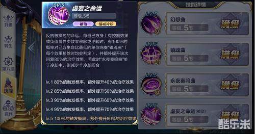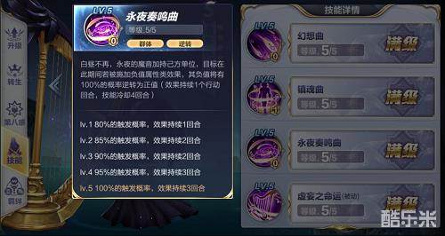 反抗被操控的命运,每当己方身上有控制效果或负值属性类效果移除或逆转时,有80%(满级100%)的概率对己方生命比最低的单位鸣奏"镇魂曲"(每个效果移除时均会判定),并额外提升该次回复40%(满级80%)的治疗效果,若此时"永夜奏鸣曲"处于冷却中,则减少1个冷却回合。这个技能的重点就在于对手多面控制时的强大反制空间,如果配合水隐小宇宙的话,在战斗中会发挥出强大的“奇效”。