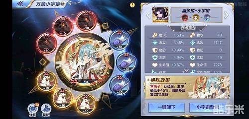 她的面板属性其实有点类似纱织,小宇宙搭配也基本和纱织相似,我们要着重佩戴副属性以念功和治疗效果为主的小宇宙,日相鹰眼、月相坚韧或生花、星相法典,套装效果都有额外生命加成,并且鹰眼或意念配合法典的念攻数值以及法典的治疗效果都非常适合潘多拉,传奇小宇宙推荐选择以保命小宇宙为主,龙牙地生、木栾子以及水隐都是不错的选择,毕竟水隐的特性是受控后进行额外回合,并不会解除控制,同样可以触发虚妄之命运。
