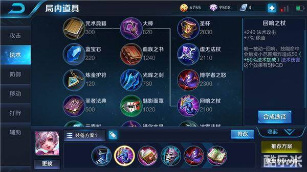 解析:这是一套全法装,第一件出秘法之靴,增加法术攻击和移动速度,使小乔在前期就有不错的伤害;回响之杖增加法术攻击和移速速度,其被动技能命中目标会造成小范围爆炸,提高了小乔的消耗能力;噬神之书增强小乔前期的续航能力,在对线不断消耗英雄还可以回复自身血量。痛苦面具是一个很全面的装备,增加法术攻击和最大生命,还减少了冷却时间,最主要的还是她的被动效果,被动折磨:技能伤害会造成额外的法术伤害,可以大大增强小乔的伤害,还有被动增加75的法术穿透,即使在前中期也可以打出高额的伤害;最后两个就出博学者之怒和贤者之书,博学者之怒的被动法术攻击提升35%再加上贤者之书增加的高额法术攻击,后期装备成型就连坦克也受不了小乔爆炸性的法术伤害。