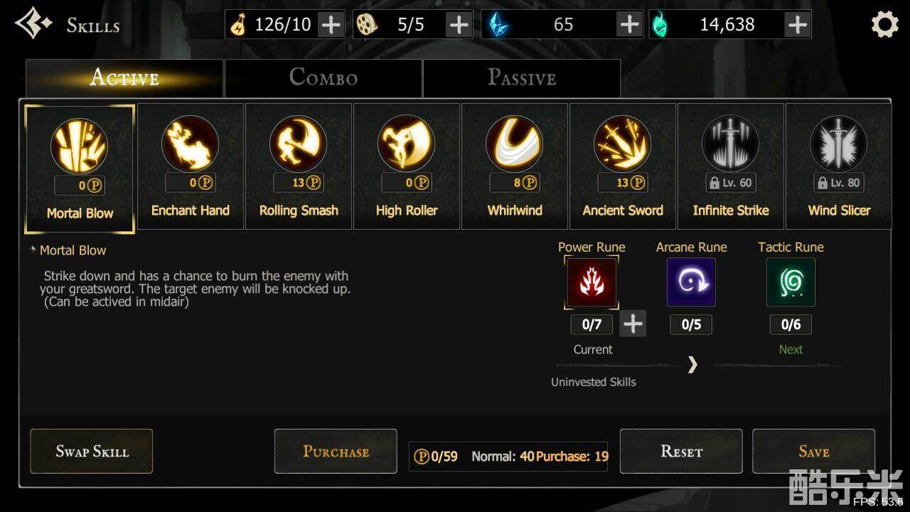 PURCHASR:购买技能点,可以看到我40级40点,购买了19点(1900钻),一共59点
