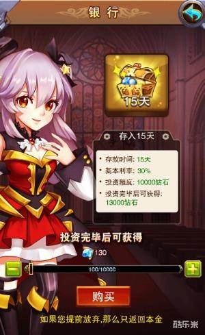 那么银行的作用到底是什么呢?那就是存钻石。根据时间存入的期限不同给予不同的利息。投资额完全由你自己掌握,如果你缺钱花了,提前放弃了,那么抠门的地精是不会给你利息的,最多只返还本金给你哦