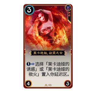 红色卡牌【莱卡迪娅,欲望之女】是一张与游戏独特的延迟机制有着强关联的卡牌。先为大家来讲解一下这张卡牌的两个技能,[莱卡迪娅的诱惑]:当对手的生物攻击莱卡迪娅时,改为随机攻击对手或他的一个生物。[莱卡迪娅的欲火]:当对手的生物对你或你的其他生物造成战斗伤害时,对它自己造成2点伤害。