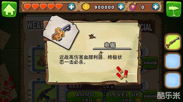电锯是在击败第五关的boss后解锁的。电锯有两个好处,1、无需修理和购买特殊的补充道具(子弹)2、可以群杀