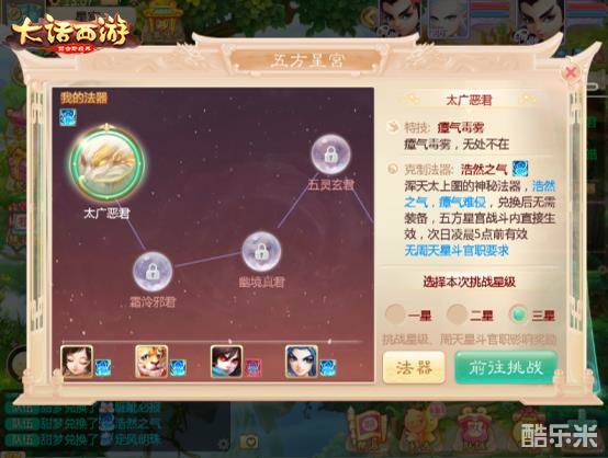五宫星天寻法器,麓战恶识肃清明。《大话西游》全新周末玩法“五方星宫”本周局测开启,玩家组队突破帝君恶识挑战,可获星力奖励,用于兑换强力法器和增益状态等丰富奖励!玩家解锁对应官职,还能兑换星官专属珍品道具!更多游戏信息,请关注《大话西游》手游官网、官方论坛。