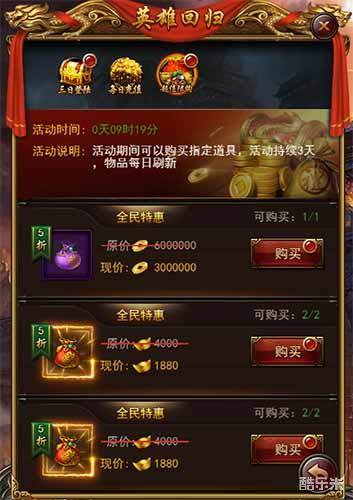 并且,回归玩家可以以超级良心的折扣购买游戏礼包,礼包内容更是非常良心,基本不需要花很多元宝就可以购买非常良心的道具来提升自身的实力!充值得到的元宝第一步当然就是购买他们啦,假如没有元宝,也可以选择购买金币礼包!