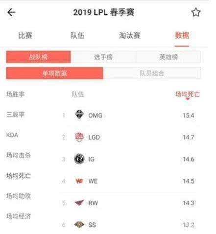 不只是一塔率,还有像那些能够影响比赛胜负的场均经济、场均助攻、场均小龙、一血率等等,OMG无一都是LPL赛区的倒数第一,就连排名不如他们的战队,都能占住中下游的水平。不过也不能说OMG全部都是倒数第一,还有一项数据他们是能排榜首的,那就是这个场均死亡率,高达15.4个人头。看到这样的战绩,更多的LOL老玩家表示遗憾,当初那个站在巅峰的队伍真的不复存在了嘛,如果照这样的水平发展下去,OMG战队的未来真的很让人担忧。