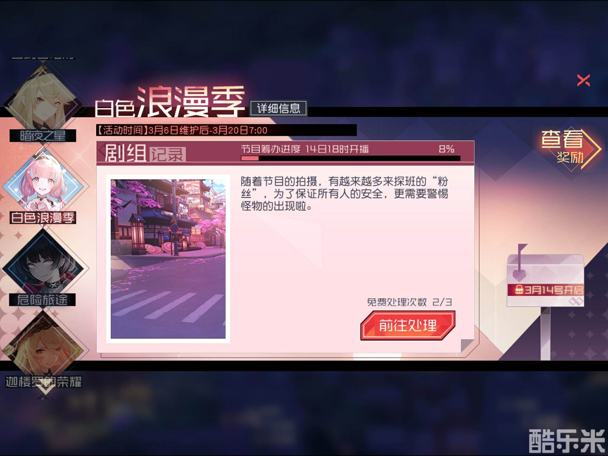 交界都市电视台筹划了一期白色情人节特别节目《白色浪漫季》,但是剧组人手似乎不太足,于是节目组找上了指挥使寻求帮助。“白色浪漫季”活动期间,节目剧组每天会向指挥使寻求不同的帮助,指挥使通关活动副本即可推进节目筹备进度。