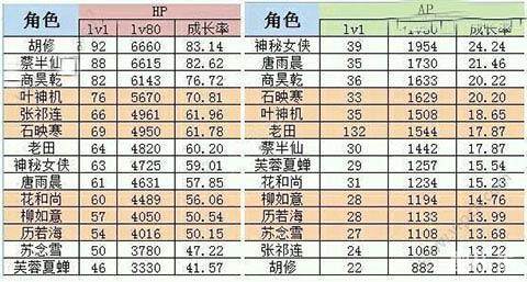 首先我们来看看各个人物的成长属性表: