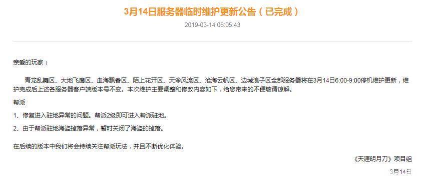 天涯明月刀3月14临时维护 暂时关闭帮派海盗掉落