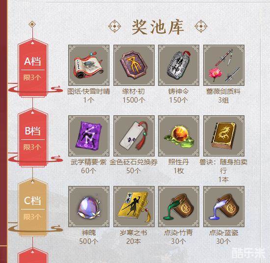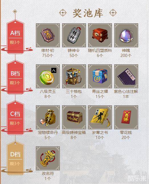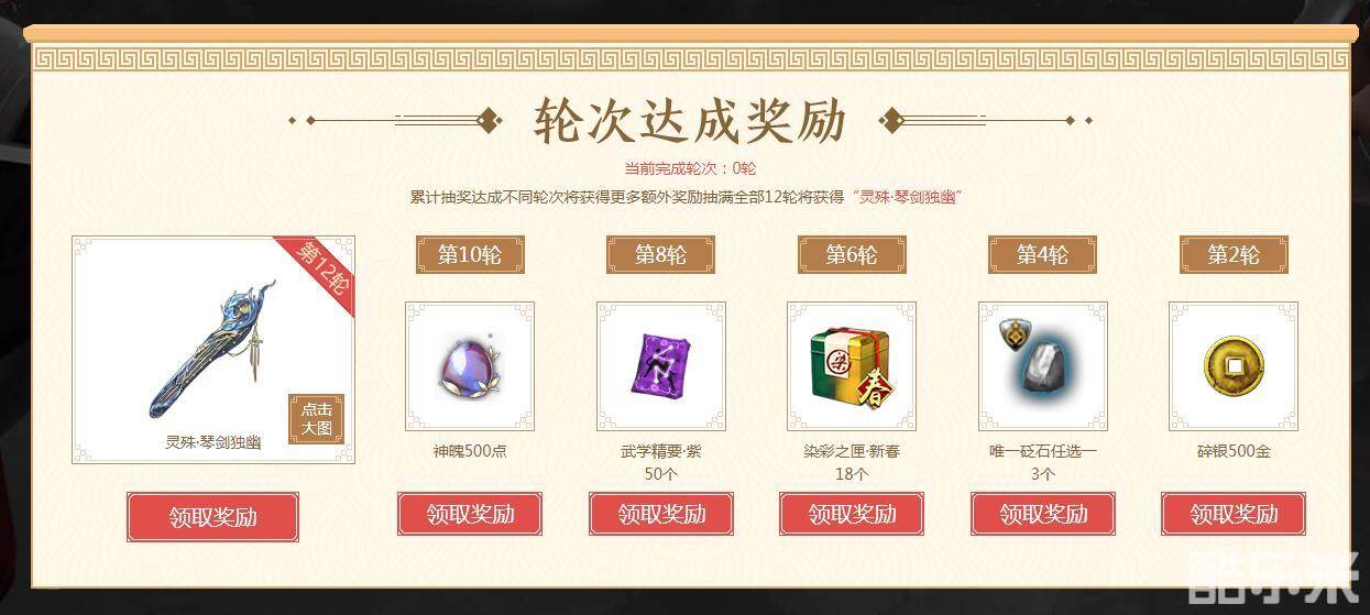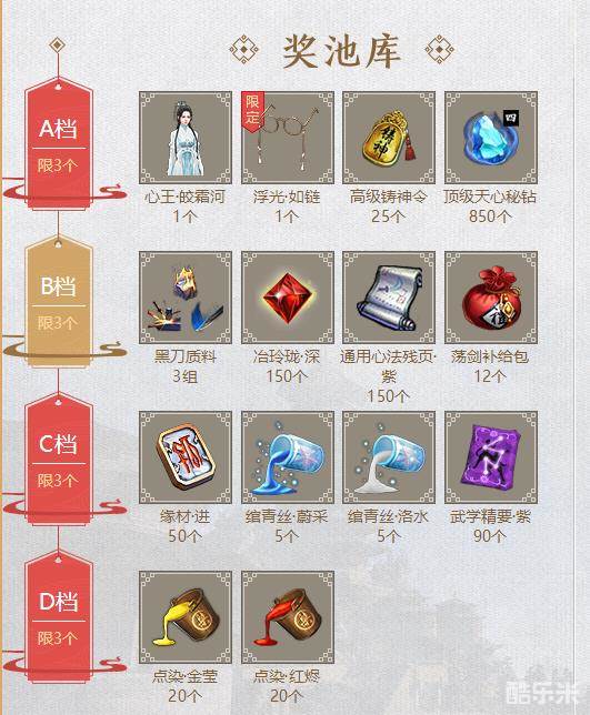 5.自选不放回奖池:抽满12轮奖励,必得全量奖池奖品。购买天字令,玩家每消费1Q币将获得10天赏积分。