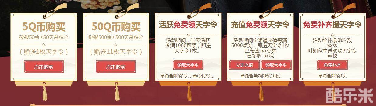 活跃度达1000的玩家可免费领取天字令1枚,单角色限1次,单QQ限3次。