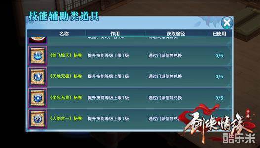 武当的4册门派秘卷分别对应于武当的四项主动技能和秘籍技能:剑飞惊天、天地无极、坐忘无我、人剑合一。也就是说,武当的主动技剑飞惊天、天地无极、坐忘无我、人剑合一的技能等级上限受门派秘卷的影响。在使用满秘卷后这四项主动技能的等级上限可由原本的15级提升至20级。