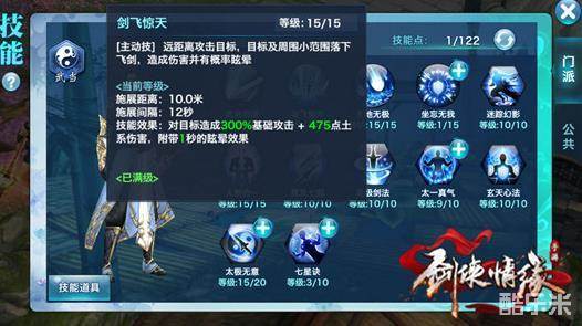 技能及效果:主动输出技能,远距离攻击目标,目标及周围小范围落下飞剑,造成一定基础攻击和土系伤害并有概率眩晕。15级的技能效果为对目标造成300%基础攻击和475点土系伤害并附带1秒的眩晕效果。使用门派秘卷可将剑飞惊天原本的15级上限提升到20级,可对敌人造成更多的基础攻击和土系伤害和更长时间的眩晕效果。
