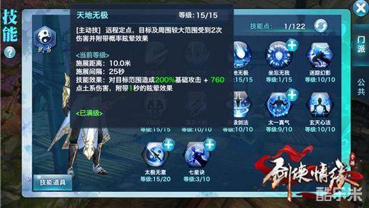 技能及效果:主动输出技能,远程定点,目标及周围较大范围受到2次伤害,对目标范围造成一定基础攻击和土系伤害,并附带概率眩晕效果。15级的技能效果为对目标范围造成200%基础攻击和760点土系伤害并附带1秒的眩晕效果。使用门派秘卷可将天地无极原本的15级上限提升到20级,可对目标范围造成更多的基础攻击和土系伤害和更长时间的眩晕效果。