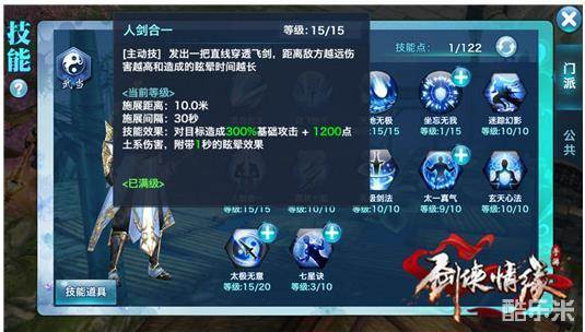 技能及效果:主动输出技能,发出一把直线穿透飞剑,对目标造成一定基础攻击和土系伤害并附带概率眩晕效果,且距离敌方越远伤害越高,造成的眩晕时间也越长。15级的技能效果为对目标造成300%基础攻击和1200点土系伤害并附带1秒的眩晕效果。使用门派秘卷可将人剑合一原本的15级上限提升到20级,可对目标范围造成更多的基础攻击和土系伤害和更长时间的眩晕效果。人剑合一是武当所有主动输出技能里伤害最高的技能,但对操作要求较高,在远距离命中对手的情况下可对敌人造成巨额伤害,但若是放偏或是被对手预判躲过,则技能伤害效果为零。