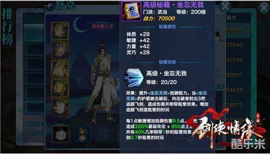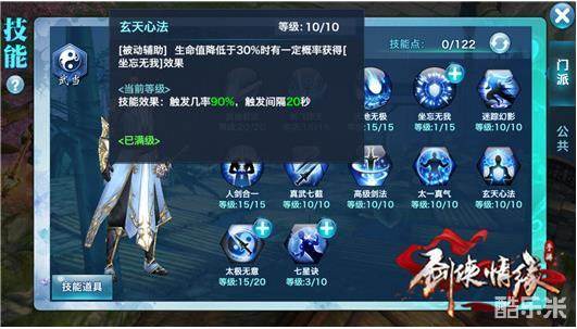 被动辅助玄天心法为保命技能,当自身生命低为30%时,有一定概率触发,获得坐忘无我效果,上限10点,必点满。