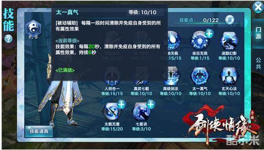 被动辅助太一真气可每隔一段时间清除并免疫自身受到的所有属性效果,最高上限为10级。10级的技能效果为每隔20秒,清除并免疫自身受到的所有属性效果并持续6秒。这一技能在团体活动中可以考虑点满(如名将、宋金战场等),可有效地提升自身的存活率和免控能力,增加自身的续航能力。但在单人PK(如门派竞技、群英会等)或是小规模战斗中(如通天、华山),可不加或少加,把多余的点数加到输出技能上面,性价比则会更高。