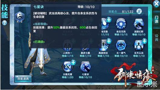被动辅助七星诀可提升自身全系抗性与生命回复,最高上限为10级。10级的技能效果为提升50%基础全系抗性和600点生命回复。这两项内容均属于防御类的属性,全抗和生命回复对武当的提升作用有限,因为这一技能加点要根据武当对自身和活动的定位来酌情考虑。防御流武当可以加满增加抗击打能力和续航能力,输出流武当这一技能可以不加或少加,把多出来的技能点用于输出技能,以追求输出的最大化。