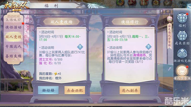 正如影院、咖啡厅中温馨浪漫的情侣座,《大唐无双手游》在白色情人节期间也为情侣们准备了甜蜜蜜的幸福专场。每周一至周五下午,相同等级段的玩家将可以双人组队报名参加双人竞技场,一起去摘下满满的“胜利小星星”。