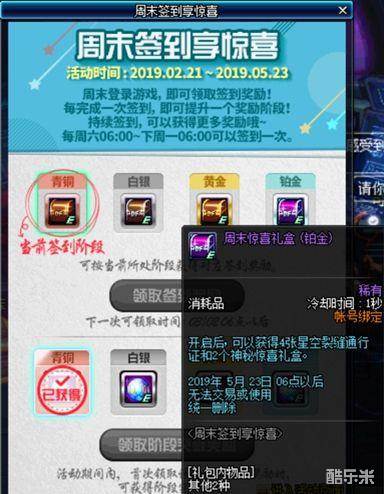 第二,周末签到享惊喜活动,顾名思义,这个活动只能在周末进行签到,并且分为4个阶段,当达到最后的铂金阶段时,可以获得4张星空裂缝通行证。