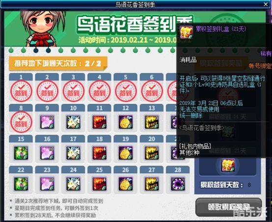 第三,鸟语花香签到季活动,当每天通关两次推荐地下城后,会自动进行签到,当签到次数累计达到21天之后,便可获得一个最终礼盒,里面包含8张星空裂缝通行证和一个90级的史诗防具自选礼盒,对于一些需要升级的小号是非常不错的选择。