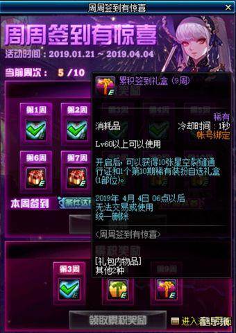 第六,周周签到有惊喜活动,这可以算得上是一个时间最长的活动了,从1月21日版本更新一直持续到4月4日,每周可以签到一次,当签到次数累积9次之后,可以获得10张星空裂缝通行证和一个第10期稀有装扮自选礼盒。