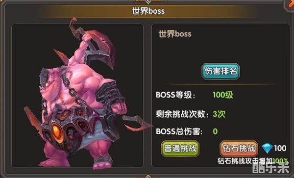 玩家每天可以挑战世界boss,每天3次挑战次数。挑战时可以选择普通挑战和钻石挑战,3次战斗的总伤害会进行记录,当boss挑战结束后玩家会根据排名获得不同的奖励。排名越高,奖励越丰厚。