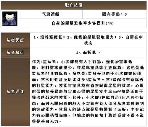 小次郎具有能收获大量星星的宝具,因此适用于“首轮攒宝具——中场出宝具——底关打暴击”的宝具暴击队战术。考虑到小次郎只有一蓝卡,队伍里有孔明之类的从者补给NP打起来会更轻松。由于小次郎自身1星输出有限,因而队伍里最好有另一个适合担任暴击的从者。具备集星技能的长江自然是首选,一回合集星与增加暴击威力的双子也可以考虑。以小次郎作为中场宝具输出的话,一般是用于有道中boss且其职阶为骑阶的副本。