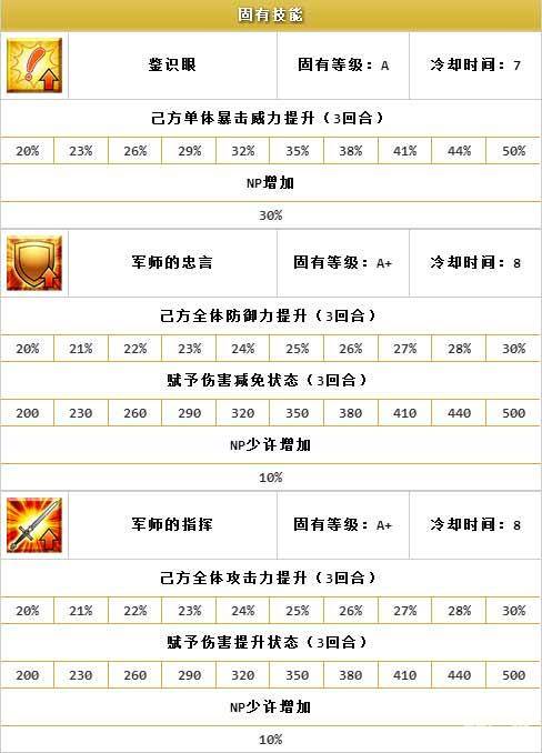 技能加强之后由五星之耻变身日天的孔明,其最大提升在于其技能能对全队直接提供NP,最高能为单个队友提供50%的NP增加,加上自身的3蓝卡与蓝宝具,说孔明是游戏内第一充电宝也不为过,能够大幅度降低队伍对开局NP礼装的需求。
