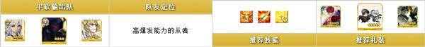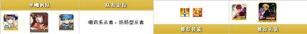用嘲讽系队友来保护高输出低生存的海叔,在嘲讽技能进入冷却的嘲讽空白期,海叔靠自身的心眼和续行来保证在下一轮嘲讽之前依然存活。为了尽可能减少嘲讽空白期,嘲讽系队友的嘲讽技能lv应尽量提高,技能等级不够时可搭配具有技能CD-2效果的阿特拉斯制服Master礼装。第三号位可以携带奶妈型从者来维持队伍的血线。