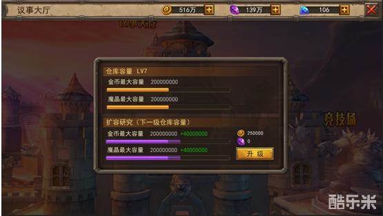 在议事大厅中可以升级扩大金币和魔晶的仓库容量,同时议事大厅的等级也限制了其他可升级建筑能够提升到的等级。